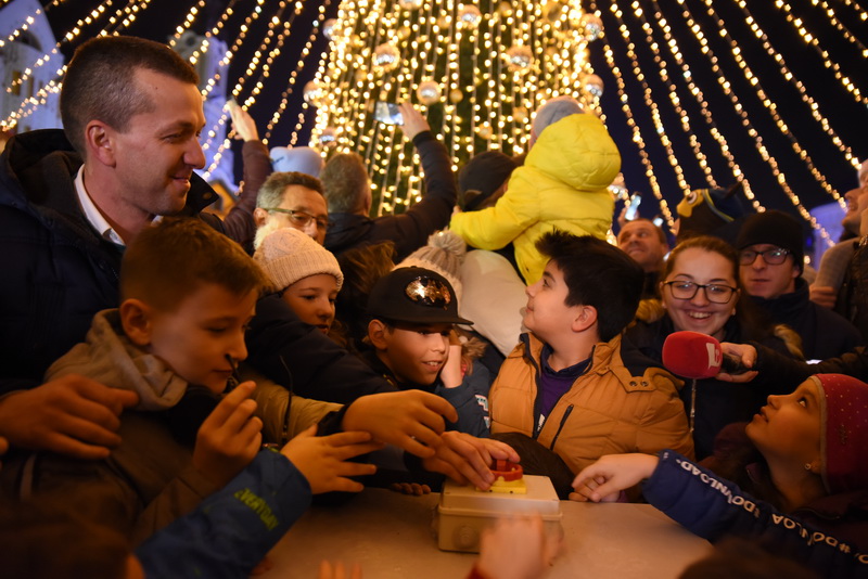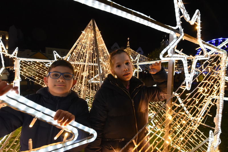 Mai mulți copii, însoțiți de viceprimarul Florin Birta, au apăsat butonul care a iluminat centrul Oradiei, chicotind veseli când au văzut rezultatul.