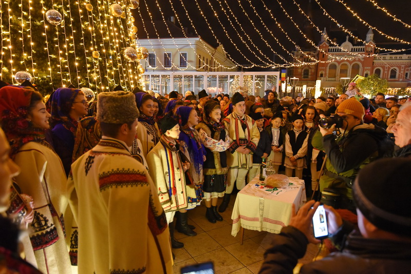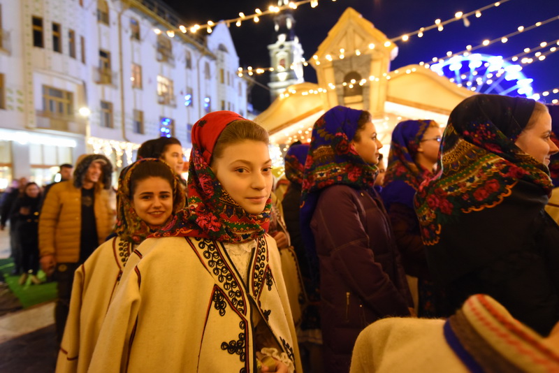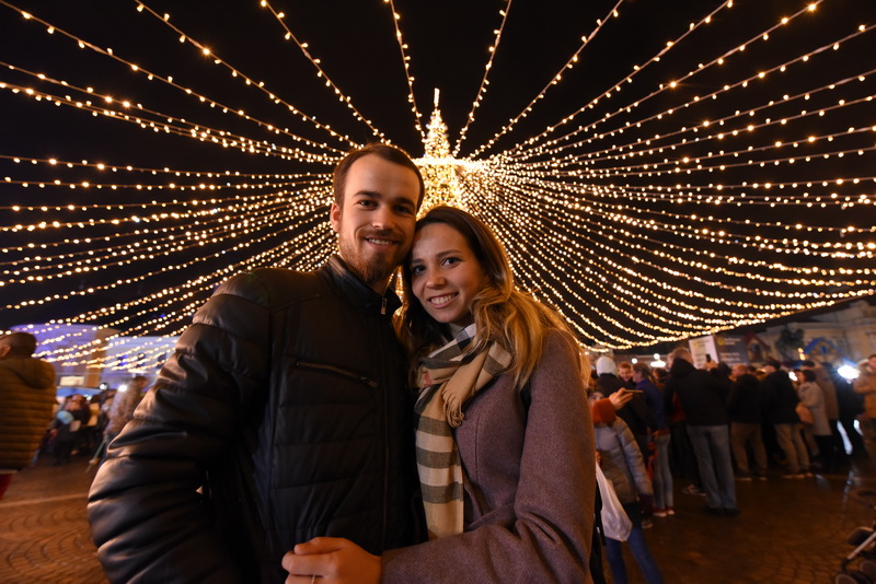 Înalt de 12 metri, bradul ecologic din centrul pieței a fost mult mai bogat decât în alți ani, fiind plin cu globuri şi luminiţe.