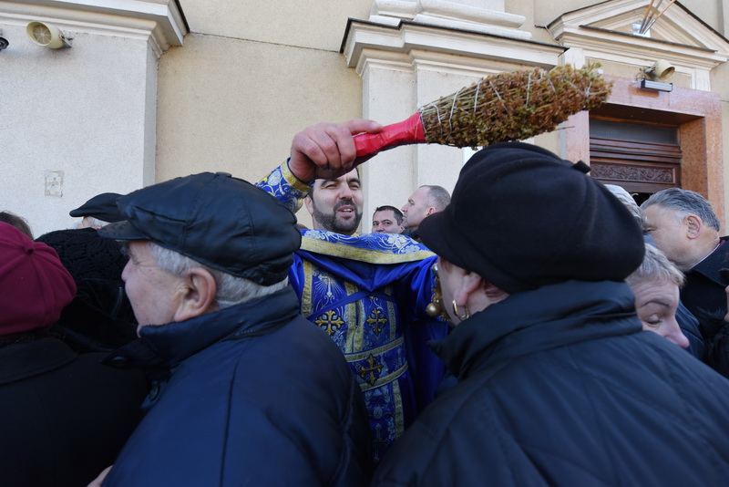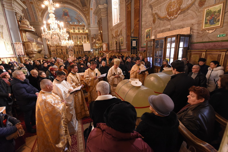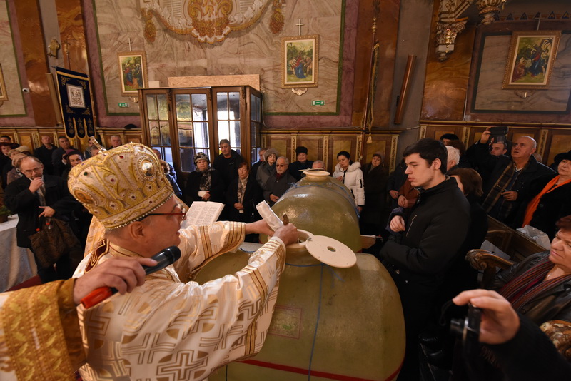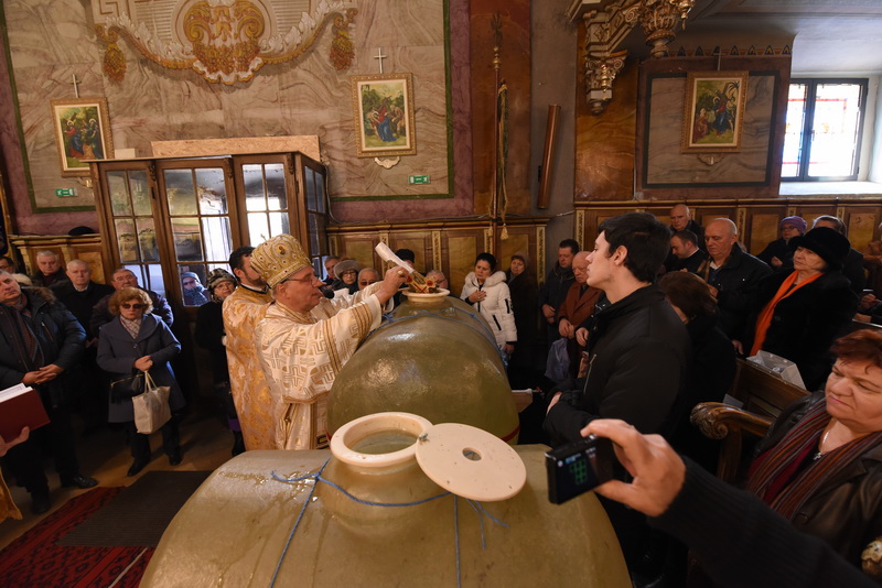 Greco-catolicii care s-au adunat în catedrală au putut să-l vadă pe episcopul Virgil Bercea, încă slăbit, dar dornic să sfințească apa pentru aproximativ 300 de orădeni.