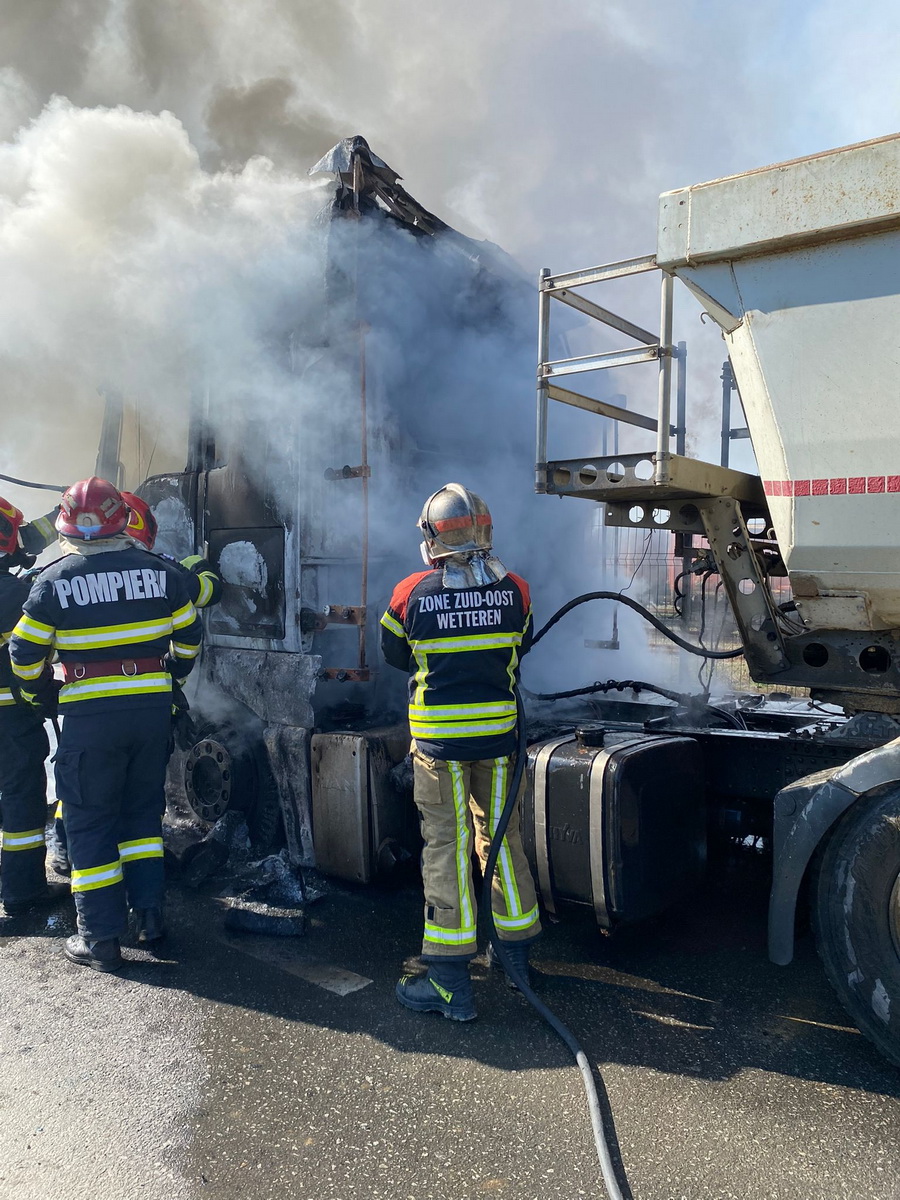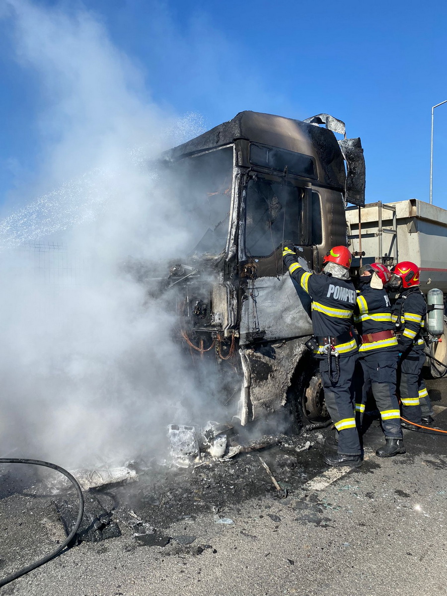 Flăcările, care se manifestau violent și generalizat la capul tractor al autovehiculului, au fost stinse în aproximativ 15 minute de echipajele de pompieri”, a precizat lt. col. Camelia Roșca.