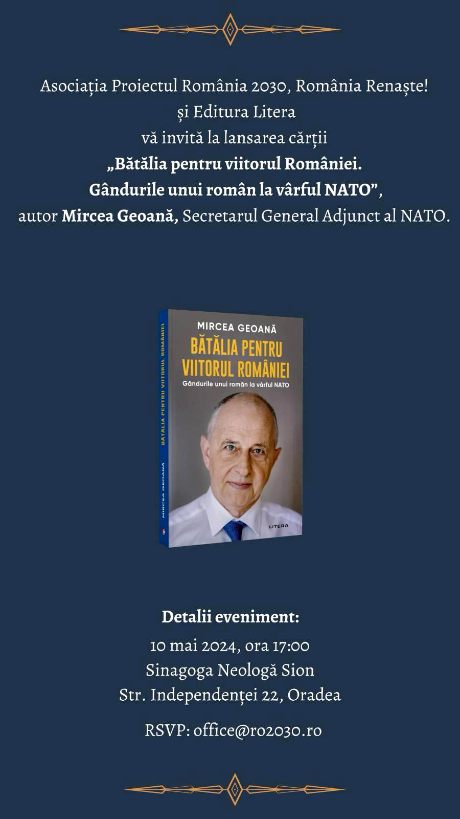 Lansarea de carte, programată pentru ora 17, este organizată de Asociația „Proiectul România 2030, România Renaște!” și Editura Litera.