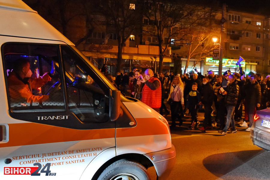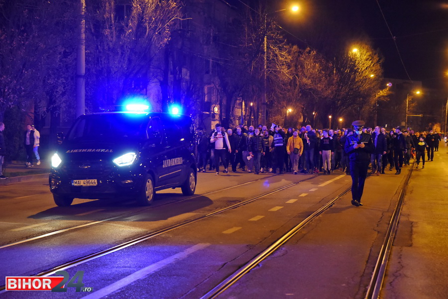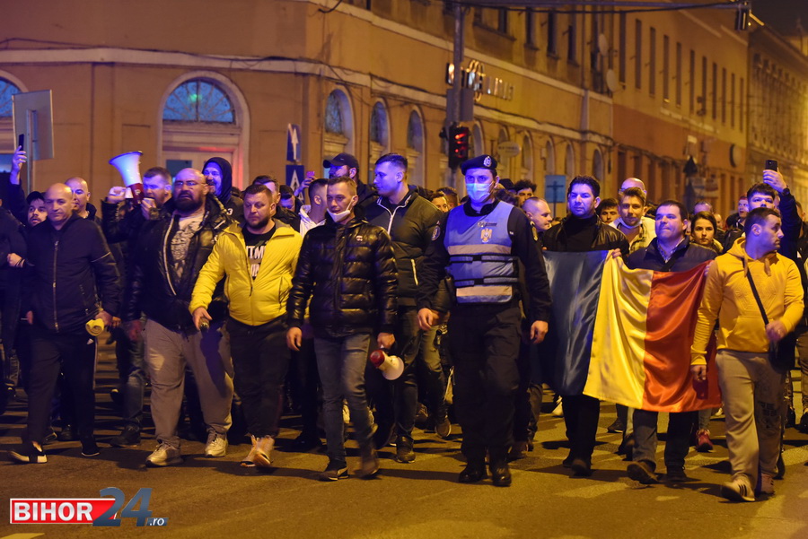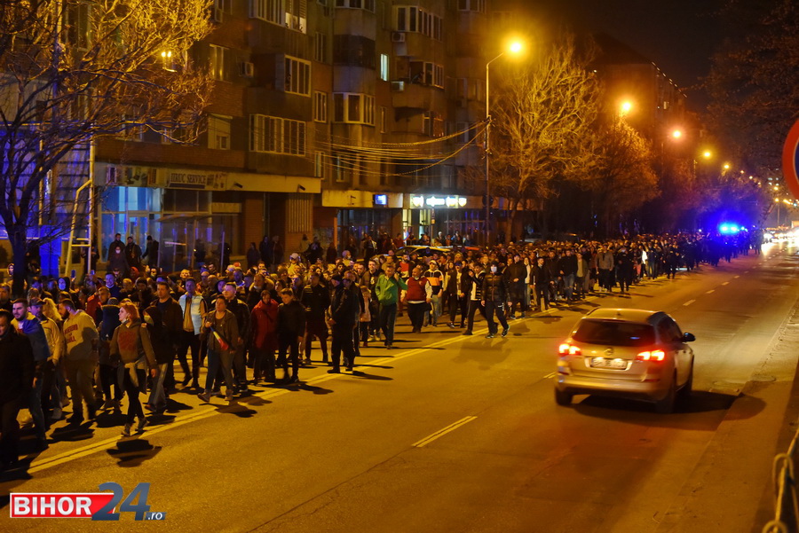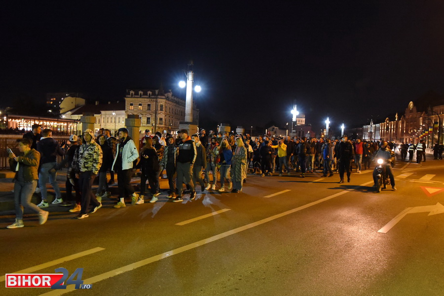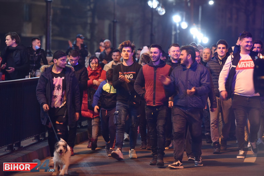 După ora 22, au ajuns în zona magazinului Crișul, iar apoi au luat-o pe Bulevardul Magheru pentru a ajunge în Piața Unirii. În centrul Oradiei, aceștia au început să scandeze numele lui Sandu Lungu, iar Lupul orădean, un cunoscut om al străzii a fluturat tricolorul.
