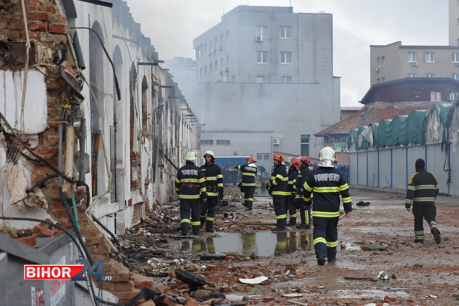 Incendiul de noaptea trecută din Piața Cetate a făcut scrum hala veche, lăsând în urmă un fum greu și grămezi din moloz.