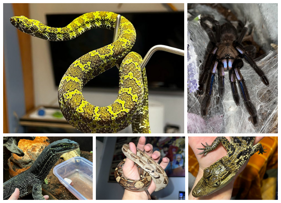 Potrivit unui comunicat publicat joi de Garda de Mediu, în locuință se aflau opt șerpi, dintre care două vipere de groapă Mangshan (Protobothrops mangshanensis), specie inclusă în Anexa II a Convenției CITES, trei șerpi Boa, un șarpe hognose vestic, un șarpe de porumb (anerystristic) și un piton. De asemenea, au mai fost găsite un varan cu pete galbene, un caiman, o țestoasă cu picioare roșii și zece tarantule.