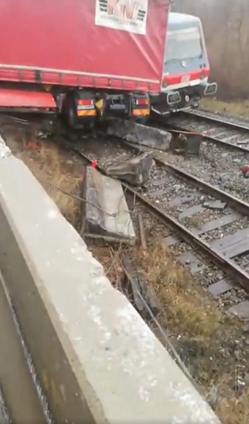 Trafic feroviar blocat între Cluj și Oradea: TIR aruncat într-un tren, după ce s-a izbit de o mașină mică (FOTO / VIDEO)
